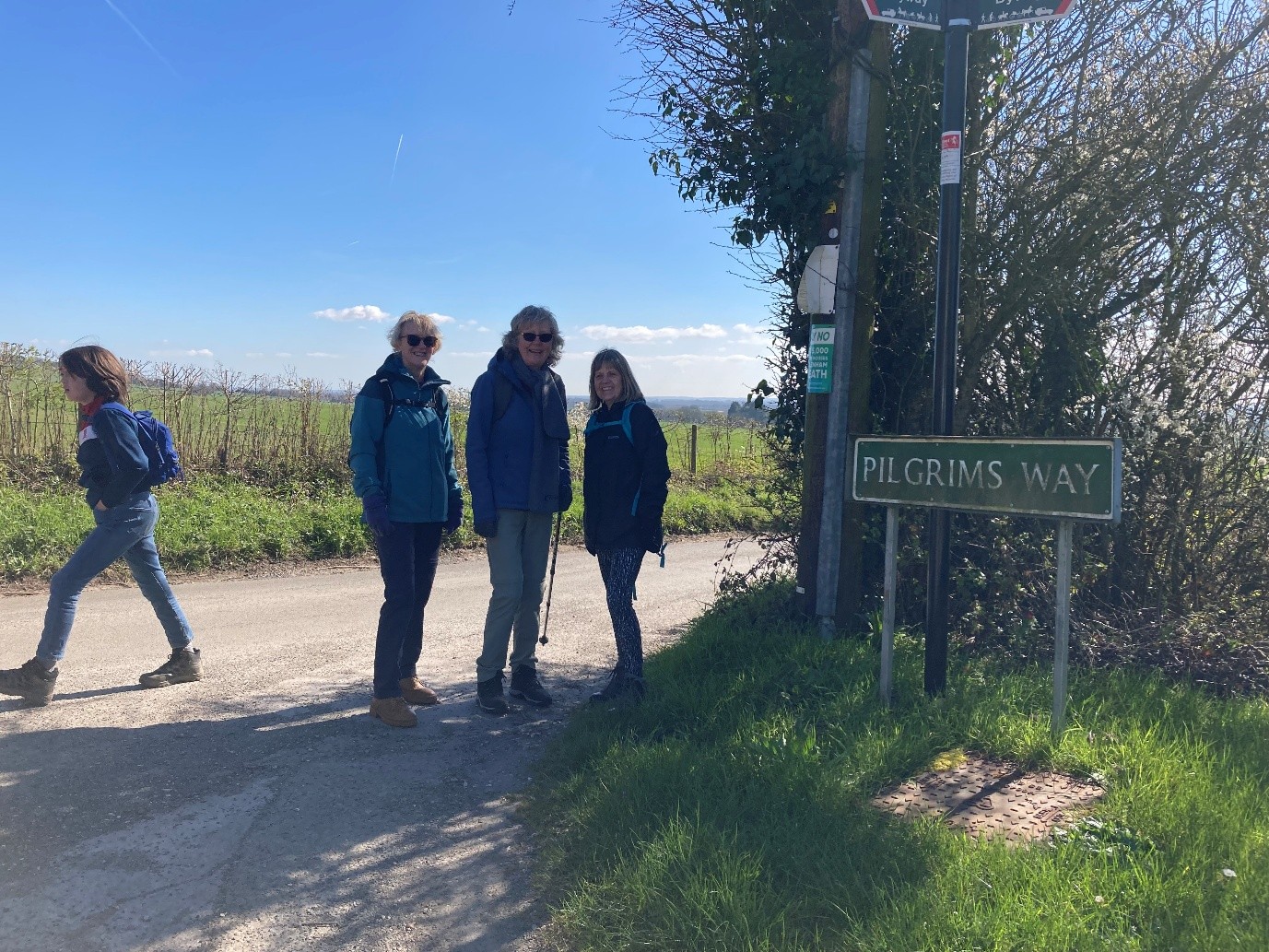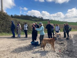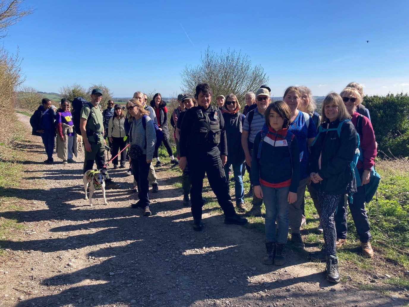 The route was mostly walked in a comfortable temperature averaging around 14º with a refreshing cooling breeze at times. The 37 walkers including the support team began the hilly accent through Charing Village to the gently undulating NDW national trail with its many striking views which were enjoyed throughout the day. Many points of interest were shared along the way e.g. farming methods, fauna and flora, history, pilgrims, the memorial chalk cross above Lenham and Percival the Pilgrim above Harrietsham. We were met by PCSO Tania Gill Jones at Lenham, there was concern that quad bike users may interrupt our walk as had been experienced by another group walking this route. Although we passed around half a dozen motor bikes (riding in ones or twos without number plates) and one car we didn’t experience any anti-social behaviour. We were grateful for Tania’s presence on the day.